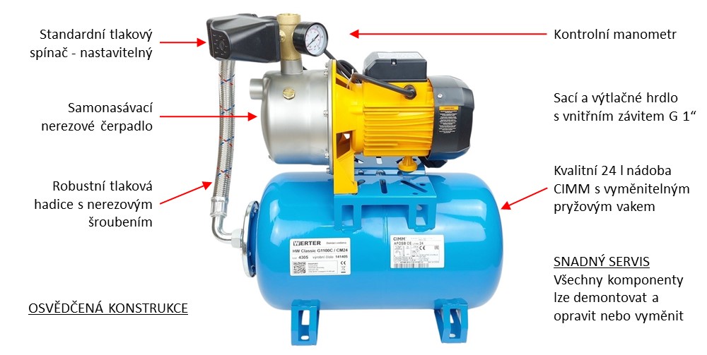 Nádoba je s čerpadlem propojena robustní tlakovou hadicí s ocelovým opletem a nerezovým šroubením. Automatické spínání čerpadla zajišťuje standardní tlakový spínač, který je z výroby nastaven na zapínací tlak 2,1 baru a vypínací tlak 3,5 baru. V případě potřeby lze však spínací i zapínací tlak snadno upravit. Součástí vodárny je také propojovací mosazná armatura a kontrolní manometr. Jedná se o jednoduchou, spolehlivou a dlouhodobě prověřenou konstrukci. Její hlavní výhodnou je snadný servis - všechny komponenty vodárny je možné demontovat a opravit nebo vyměnit.