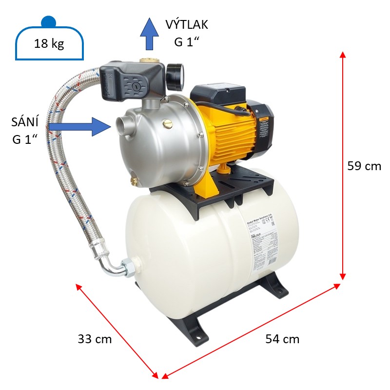 Nádoba je s čerpadlem propojena robustní tlakovou hadicí s ocelovým opletem a nerezovým šroubením. Automatické spínání čerpadla zajišťuje standardní tlakový spínač, který je z výroby nastaven na zapínací tlak 2,1 baru a vypínací tlak 3,5 baru. V případě potřeby lze však spínací i zapínací tlak snadno upravit. Součástí vodárny je také propojovací mosazná armatura a kontrolní manometr. Jedná se o jednoduchou, spolehlivou a dlouhodobě prověřenou konstrukci. Její hlavní výhodnou je snadný servis - všechny komponenty vodárny je možné demontovat a opravit nebo vyměnit.