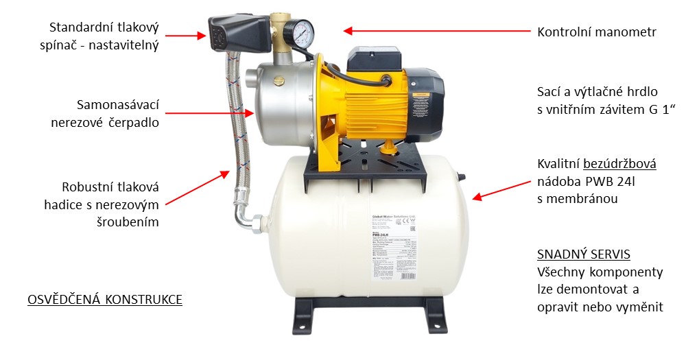 Součástí vodárny je značková tlaková nádoba Global Water PWB 24 LH o objemu 24 litrů, přičemž využitelný objem nádoby je cca 7 litrů vody. Jedná se o vysoce kvalitní tlakovou nádobu s butylovou membránou, která má oproti klasickým nádobám s vakem řadu výhod. Nádoba má vnitřní vložku ze zdravotně nezávadného polypropylenu. Vstupní otvor tvoří patentovaná nerezová přípojka bez příruby, takže nedochází ke korozi, což je častý problém klasických nádob s přírubou. Mosazný vzduchový ventilek je utěsněn v plastovém víčku s o-kroužkem, který zabraňuje úniku vzduchu. Díky své vzduchotěsnosti a vodotěsnosti je nádoba bezúdržbová, takže není nutné doplňovat vzduch ani měnit vak. Nádoba má také atest pro pitnou vodu.