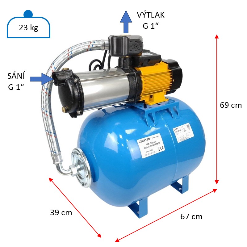 Klasická domácí vodárna s tlakovou nádobou a samonasávacím čerpadlem pro zásobování vodou v domovních aplikacích, pro zavlažování nebo zvyšování tlaku vody. Motor o výkonu 1100 W.
