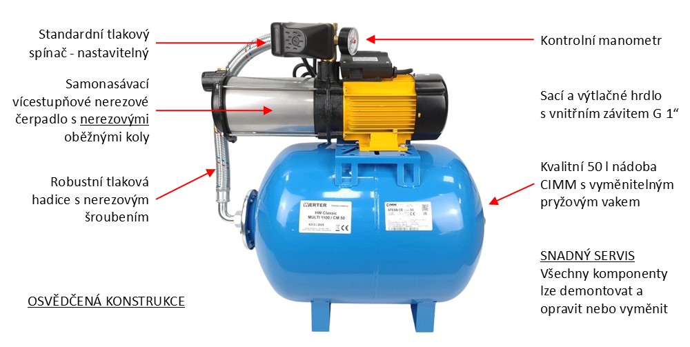 Nádoba je s čerpadlem propojena robustní tlakovou hadicí s ocelovým opletem a nerezovým šroubením. Automatické spínání čerpadla zajišťuje standardní tlakový spínač, který je z výroby nastaven na zapínací tlak 2,1 baru a vypínací tlak 3,5 baru. V případě potřeby lze však spínací i zapínací tlak snadno upravit. Součástí vodárny je také propojovací mosazná armatura a kontrolní manometr. Jedná se o jednoduchou, spolehlivou a dlouhodobě prověřenou konstrukci. Její hlavní výhodnou je snadný servis - všechny komponenty vodárny je možné demontovat a opravit nebo vyměnit.
